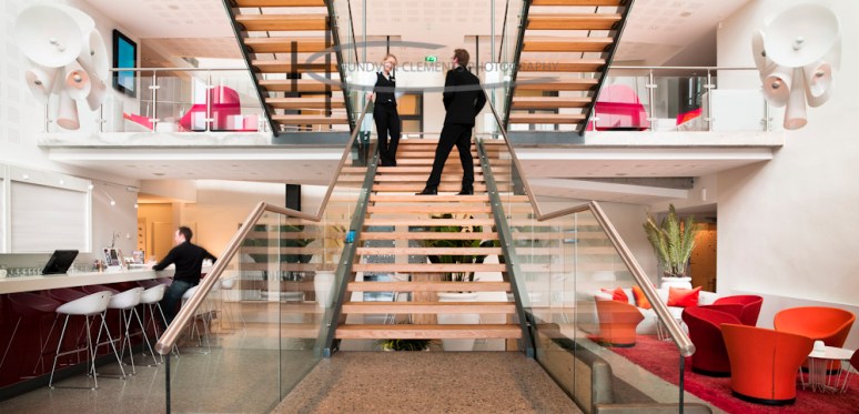 A bold use of reds, yellows and oranges provides warmth to a part of the world that is not exactly renowned for it’s sunshine! We arrived under a blanket of grey cloud just before it started raining. Luckily the interior space was our primary focus for this shoot with just an overview for reference of the exterior on the shoot list. An adjoining office block is currently under construction designed in the same visual language to provided an intergrated aesthetic to this exciting city development. Hopefully we will be back to document the innercity dock renovation when it is fully completed.