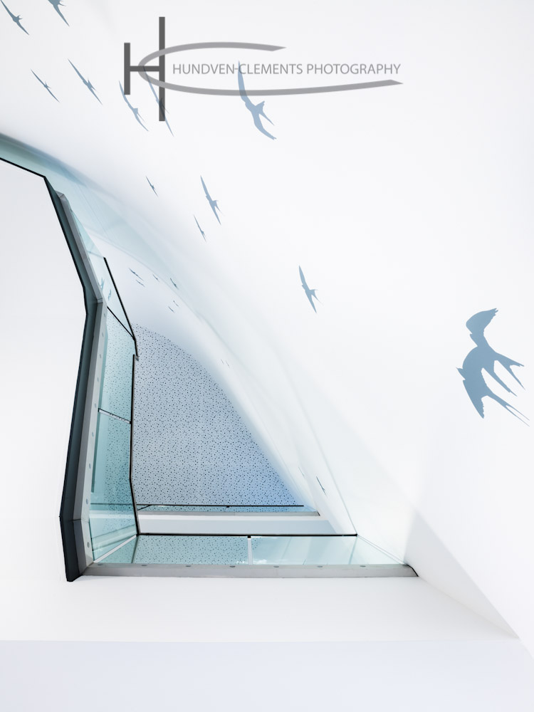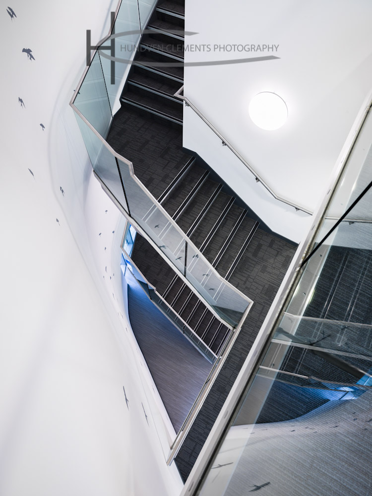 ”Responding to its location and context, this distinctive modern landmark incorporates a dynamic curved sweep of rippled zinc cladding which wraps around the feature stair and links to the angled canopy beyond”.