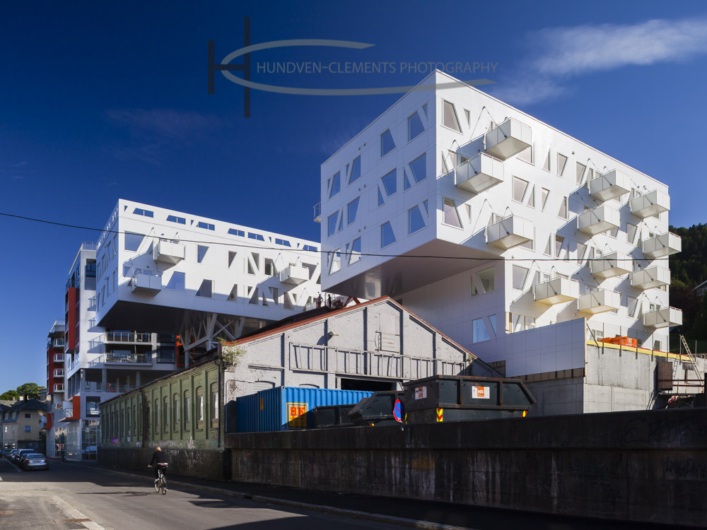 The Norwegians may be considered one of Europe’s most conservative societies but the designers at Link Arkitektur AS in Bergen are certainly having some fun with their designs. This new residential project overhang’s the preserved facade of an old foundry. The renovation of the old foundry into a shop will be the next stage of the project.