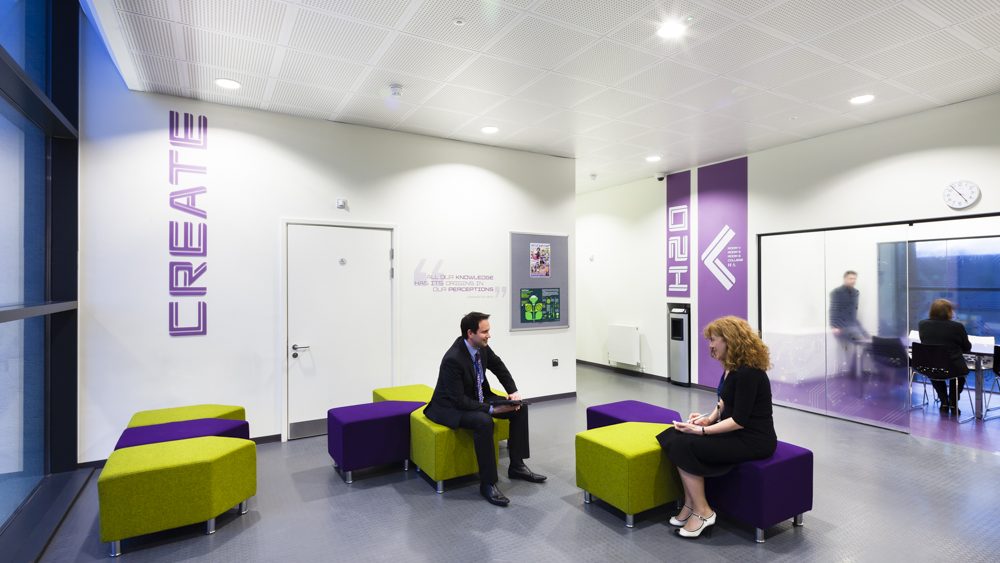 Combining enterprise learning and real work the school offers an alternative to classroom based learning. We thought the open plan designs and integrated graphics provided the perfect environment for education.