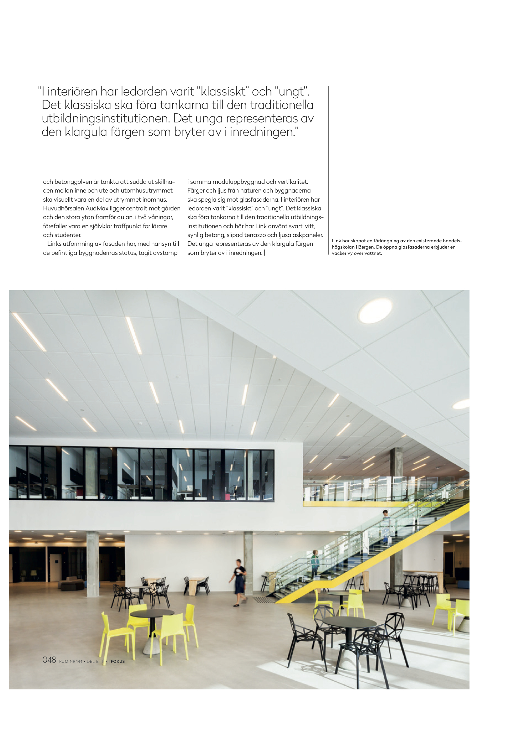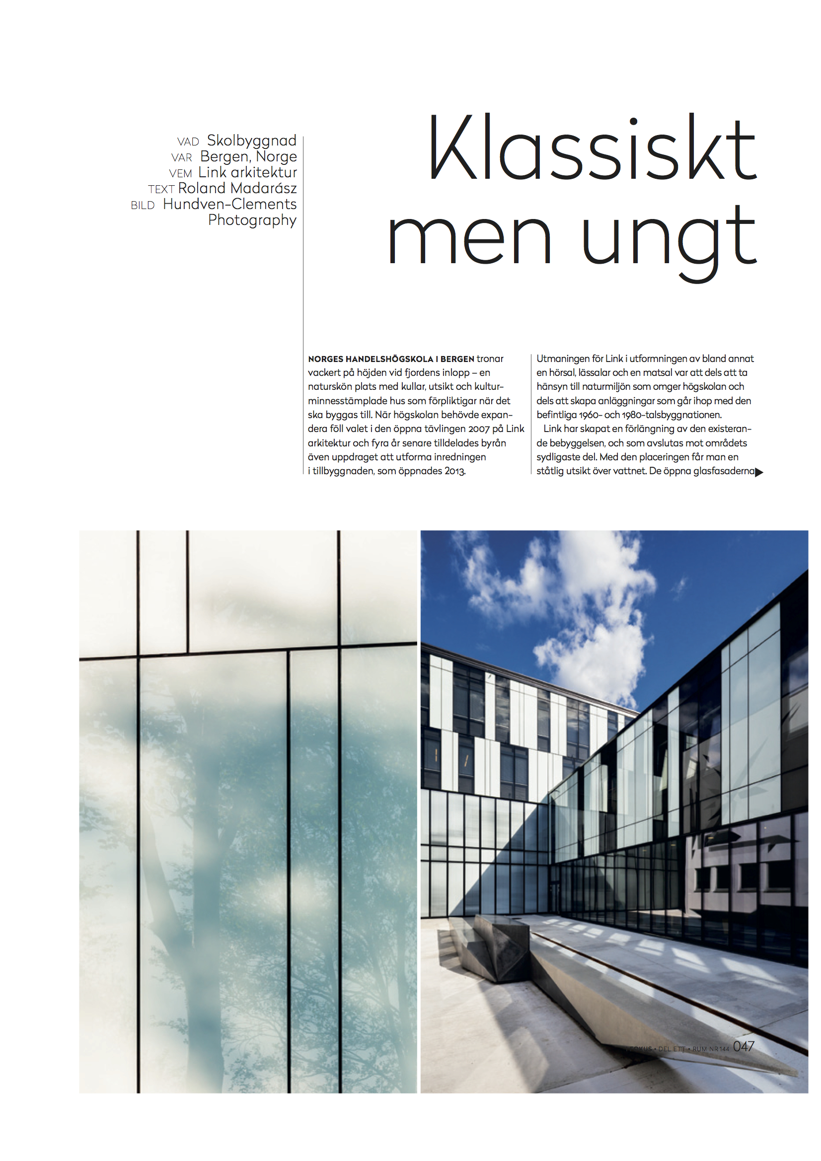 Published in Sweden’s leading design magazine RUM. NHH incorporates an exciting exterior surface design reflecting the surrounding forest in the glass panel. Link Arkitektur were very keen for the building to almost disappear within the forest, minimising visual disturbance to the surrounding landscape. Internally the large open plan spaces are interspersed with funky art work and a who’s who of scandinavian chair design.