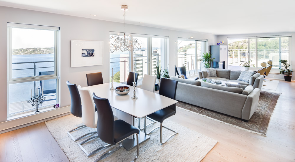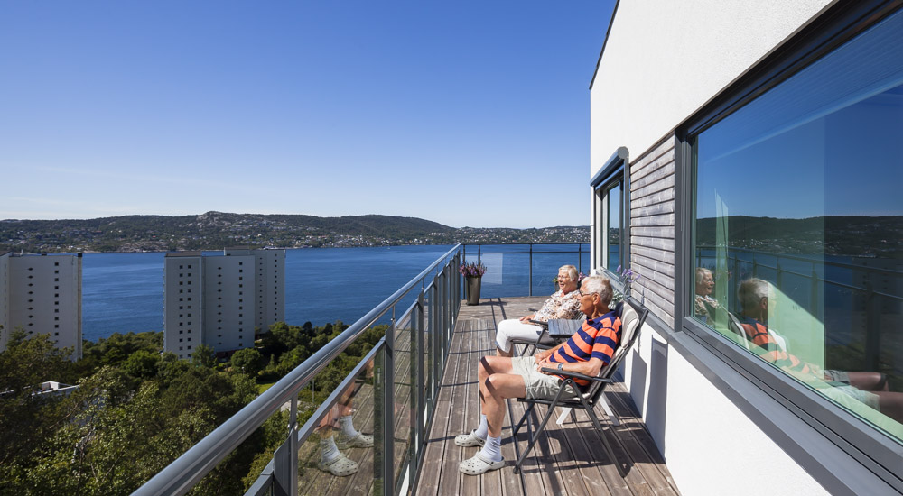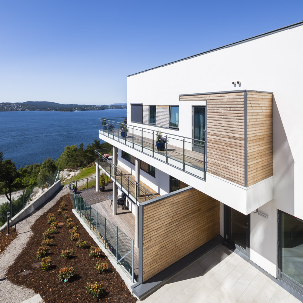 Combining white rendered concrete with wooden cladding has provided a mediterranean feel to this residential property. We we’re lucky with the weather on our visit as the sun beat down over the fjords at Hellen Panorama designed by Link Arkitektur.