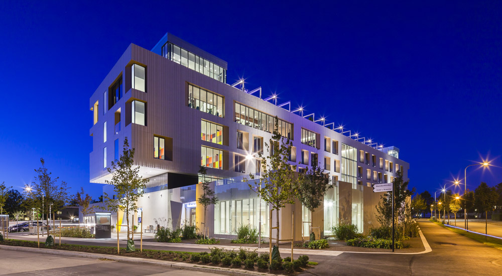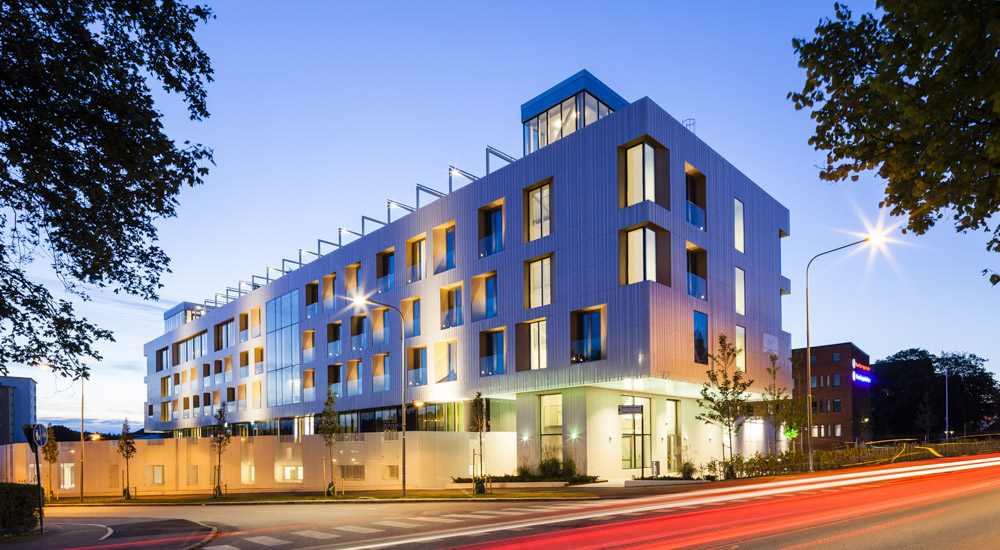 Front facade at night of Skandion Klinikken & Hotel Von Kraemer, Uppsala, Sweden designed by Link Arkitektur.