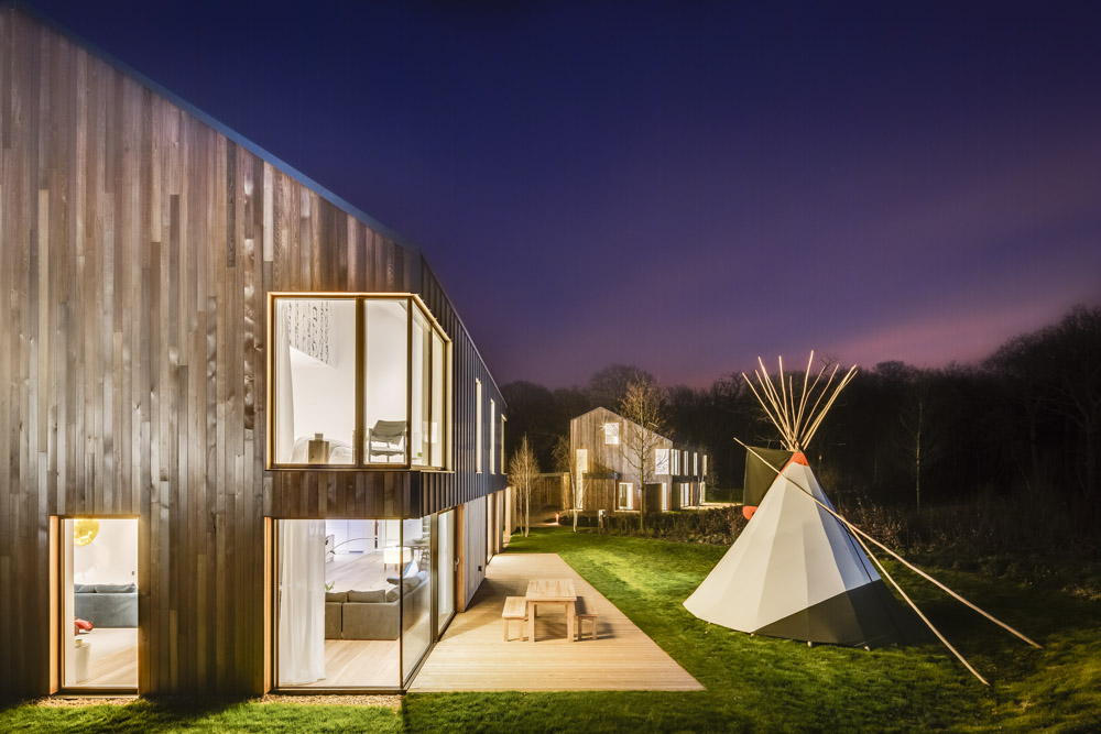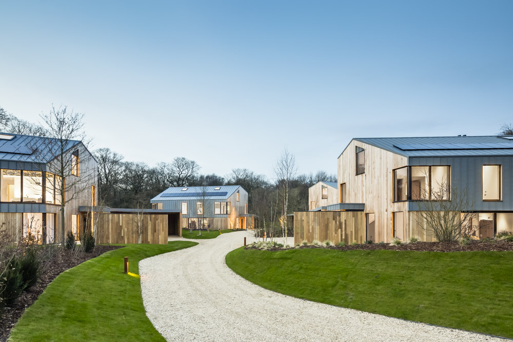 Exterior view of The Woods residential property at dusk designed by Scott Brownrigg, Bedfordshire, UK.
