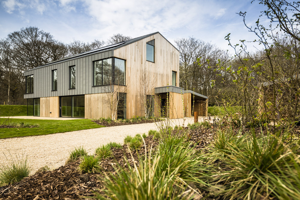 Exterior of a house at The Woods residential property designed by Scott Brownrigg, Bedfordshire, UK.