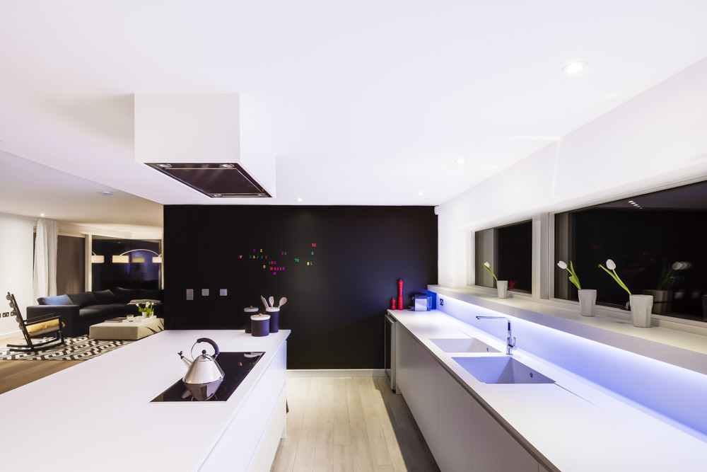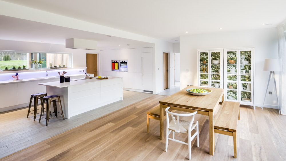 Kitchen and dinning room area at The Woods residential property designed by Scott Brownrigg, Bedfordshire, UK.