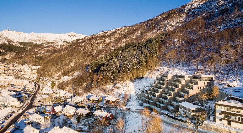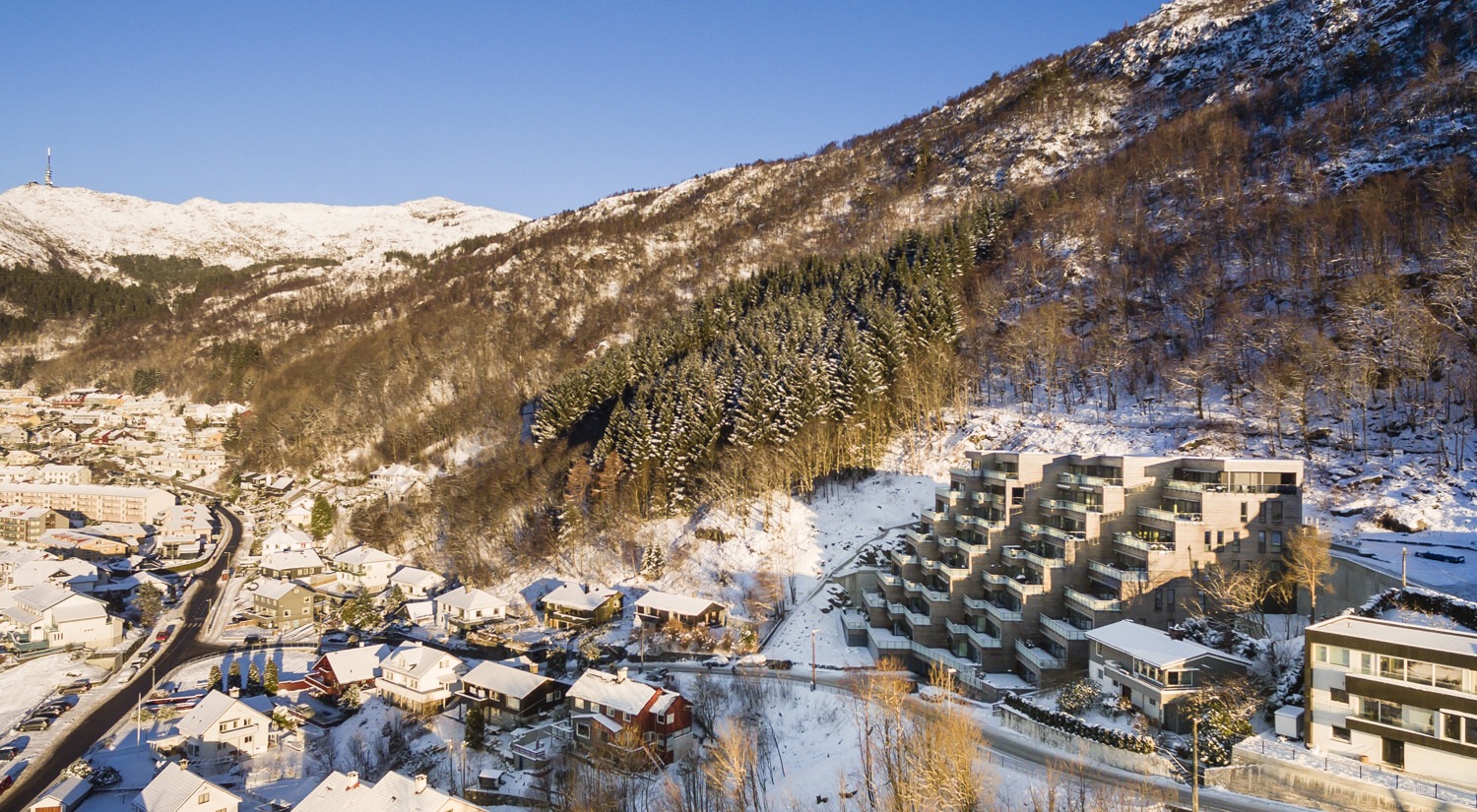 Time for some winter drone flying. A sprinkling of snow over this unusual housing project at the foot of Ulriken by Link Arkitektur in Bergen