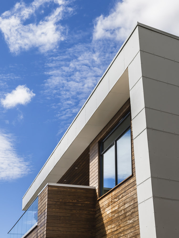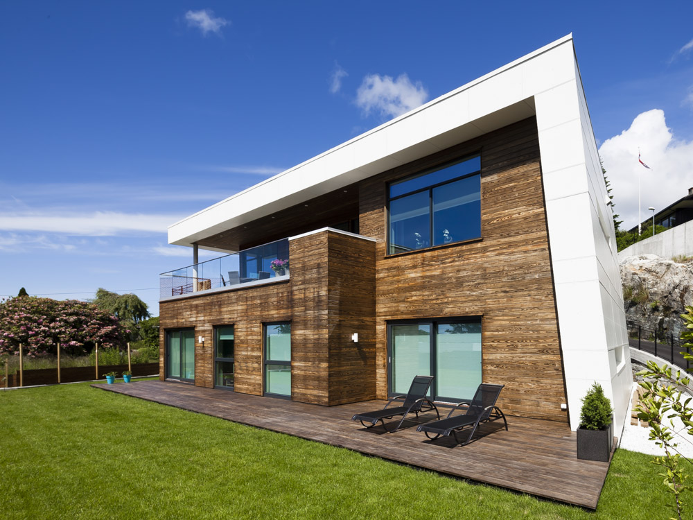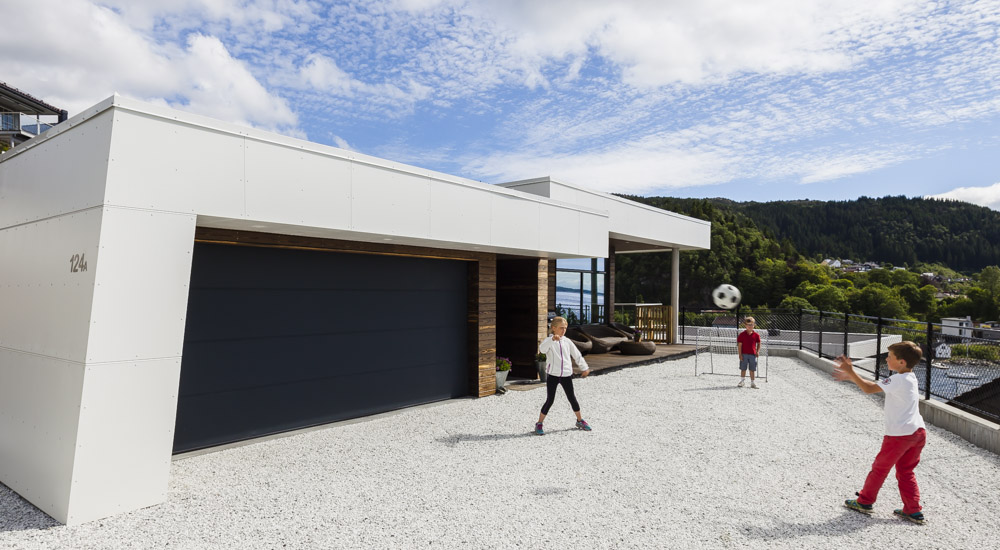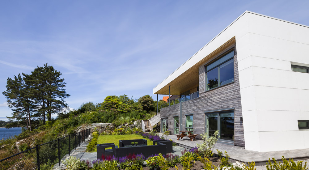 Combining white rendered concrete with wooden cladding has provided a mediterranean feel to this residential property. We we’re lucky with the weather on our visit as the sun beat down over the fjords at Hellen Panorama designed by Link Arkitektur.