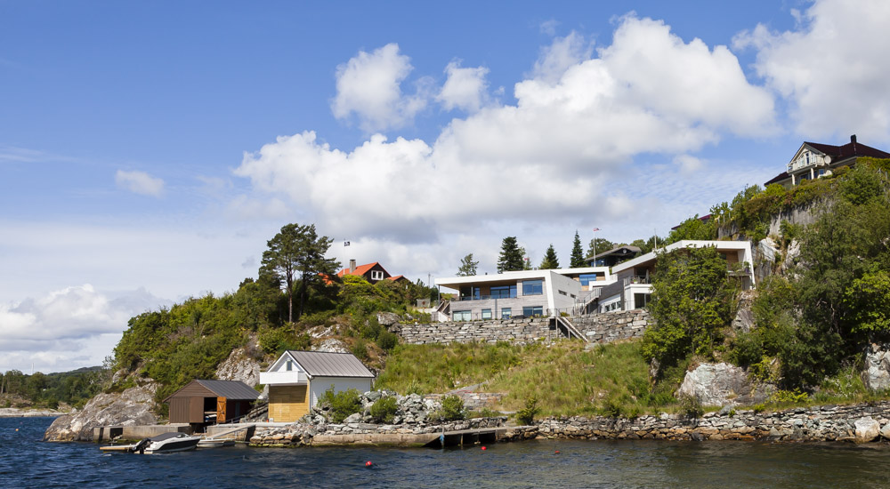 Three properties using the same visual language but with different volumes and surface materials. A small rocky out crop in the fjords provides a dramatic location for these innovative housing designs.