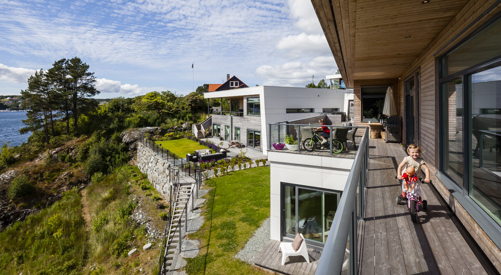 Link Arkitektur have had some fun on the drawing board here, the angled walls visually minimise the overall appearance of the structures. Split over two floors the properties afford unobstructed views out to sea. Large balconies were a priority for all of the residents so their children can plan safely in a controlled space at young age. The gardens back on to drops of over 10 meters down to the small harbour.