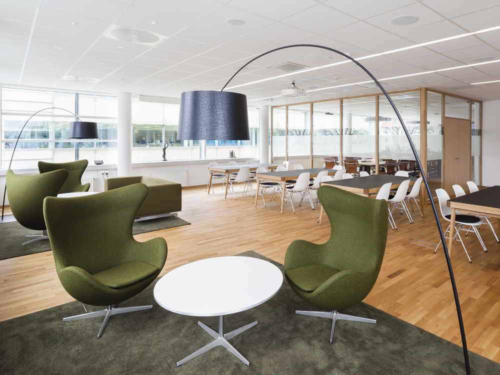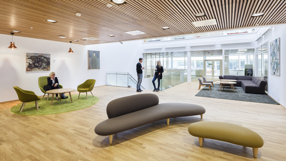 Published in Sweden’s leading design magazine RUM. NHH incorporates an exciting exterior surface design reflecting the surrounding forest in the glass panel. Link Arkitektur were very keen for the building to almost disappear within the forest, minimising visual disturbance to the surrounding landscape. Internally the large open plan spaces are interspersed with funky art work and a who’s who of scandinavian chair design.